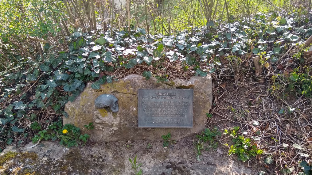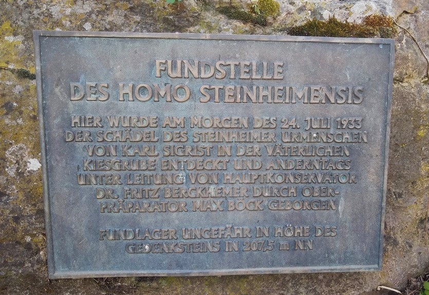 Der Gedenkstein am Fundort des Homo steinheimensis liegt etwas versteckt in einem neuen Wohngebiet von Steinheim an der Murr im Gebiert der früheren Kiesgrube. Eine Kopie dieses Funds (Original ist